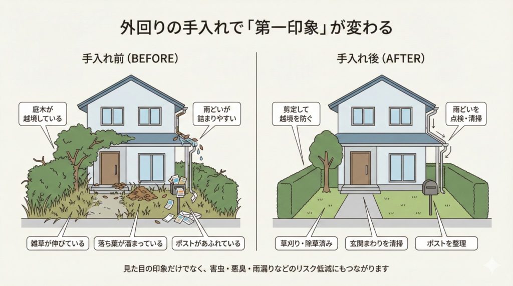 庭木が伸び放題になっていたり、雑草が生い茂っていたりすると、管理されていない空き家として敬遠される原因になります。