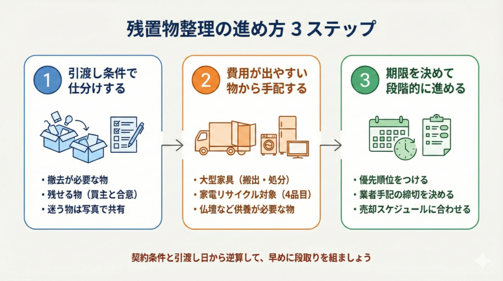 残置物がある場合は、処分費用と売却条件の整理が先決です。進め方の全体像を確認しておくと安心です。