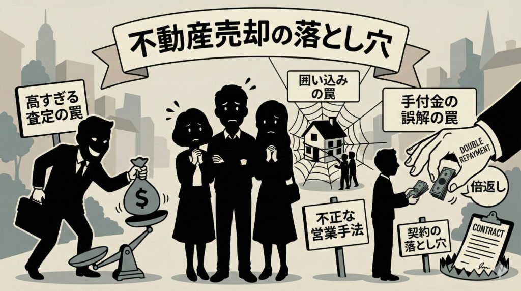 不動産売却では、不動産会社の高すぎる査定や囲い込みといった不正な営業手法、手付金に関する誤解など売主が知っておくべき多くの落とし穴が存在します。
